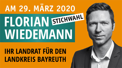 Der Landratskandidat der FWG Landkreis Bayreuth hat es geschafft: Er gewinnt die Landratstichwahl am 29.03.2020 gegen Klaus Bauer (CSU) und damit stellt die FWG erstmals im Landkreis Bayreuth den Landrat. Mit 28.812 Stimmen erzielte Wiedemann 51 % bei einer Wahlbeteiligung von 66,67%.