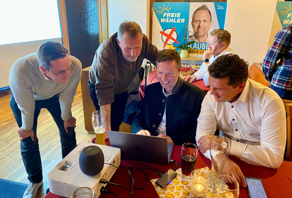 Spannend ging es zu bei der Wahlparty der Freien Wähler der Stadt und des Landkreises Bayreuth in der Fliegerschänke Strössenreuther in Speichersdorf. Als um 18 Uhr die Prognose präsentiert wurde, standen die Freien Wähler bei 14 Prozent. Ob das zu drei Landtagsmandaten für die Freien Wähler in Oberfranken reichen würde, war völlig unklar. Von Hochrechnung zu Hochrechnung ging es aber stets bergauf, so wie es Landeschef Hubert Aiwanger im BR-Interview prophezeit hatte.