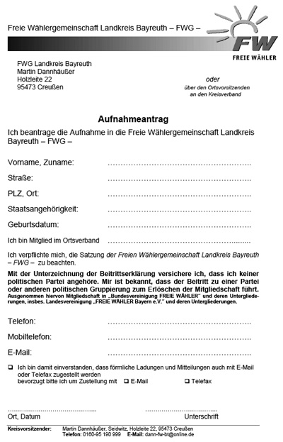 AUFNAHMEANTRAG Hier können Sie den Aufnahmeantrag in die Freie Wählergemeinschaft Landkreis Bayreuth herunterladen.